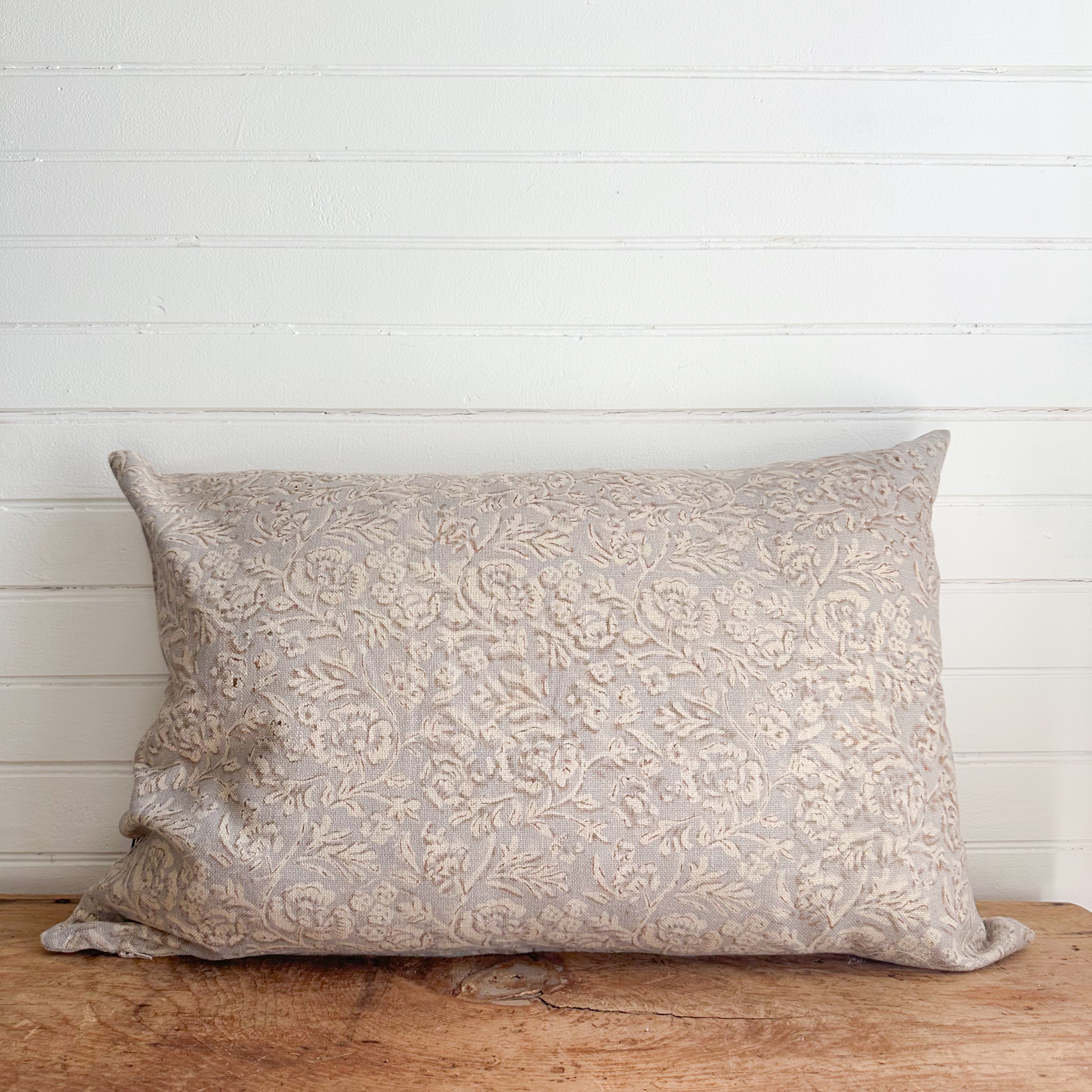 Entirely crafted by hand, this block print pillow features an ivory rose on gray background. Made from 100% cotton and the cover is machine mashable on gentle. Great for your couch or even an accent on your bed.