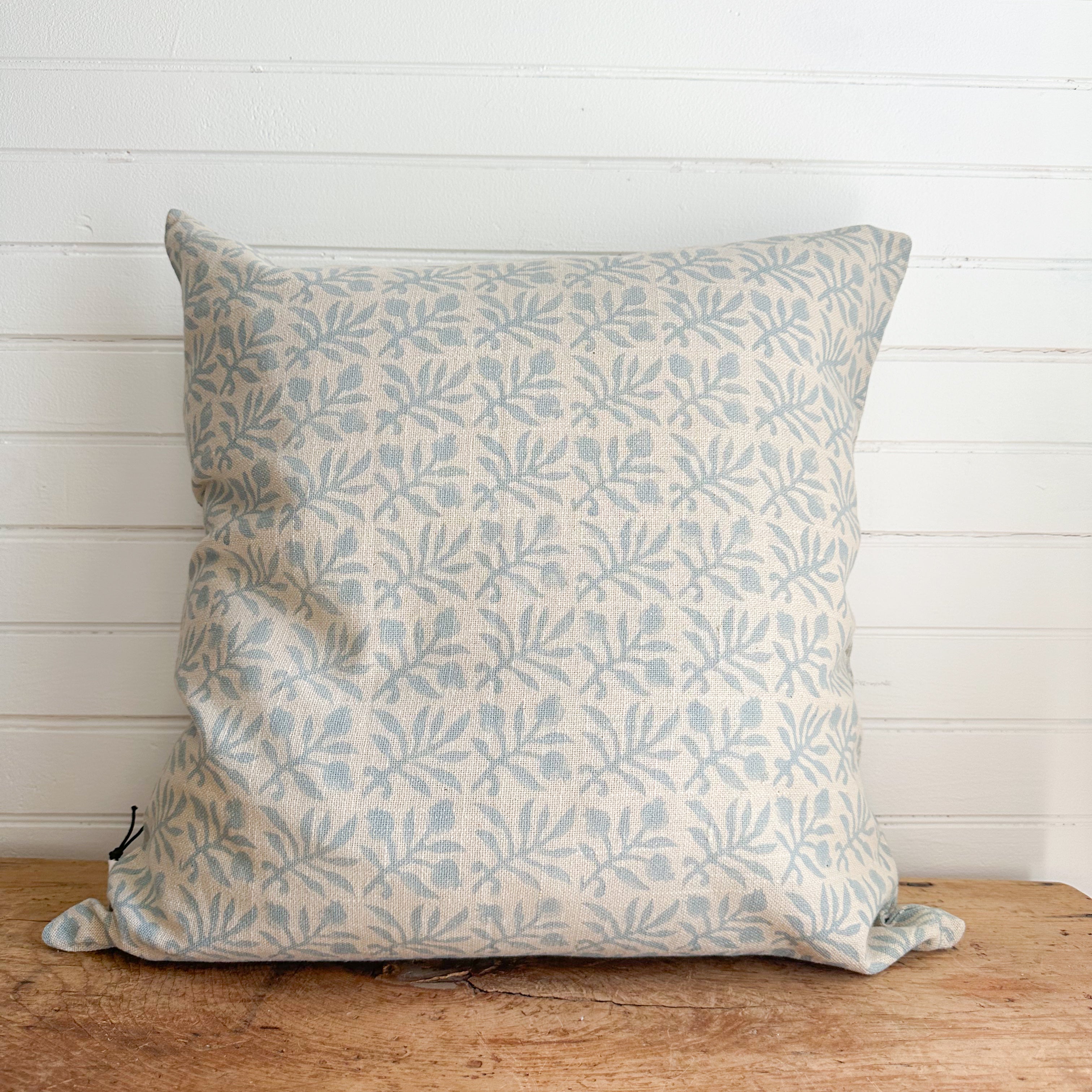 Entirely crafted by hand, this block print pillow features a soft blue flower on neutral background. Made from 100% cotton and the cover is machine mashable on gentle. Great for your couch or even an accent on your bed.